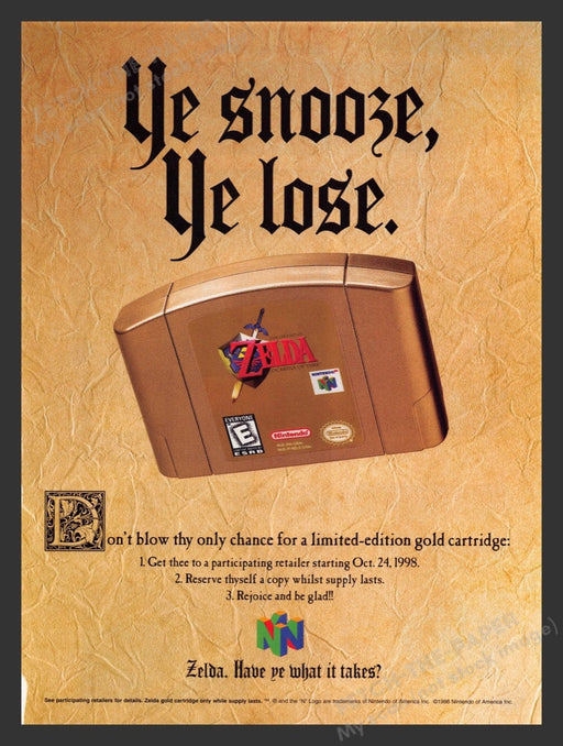 Zelda "Ye snooze, ye lose" 1990s Video Game Print Advertisement 1998
