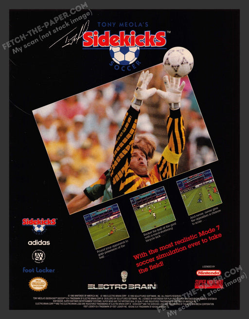 This 1993 print advertisement features Tony Meola's Sidekicks Soccer, a popular video game from the 1990s. The ad showcases an action-packed image ...