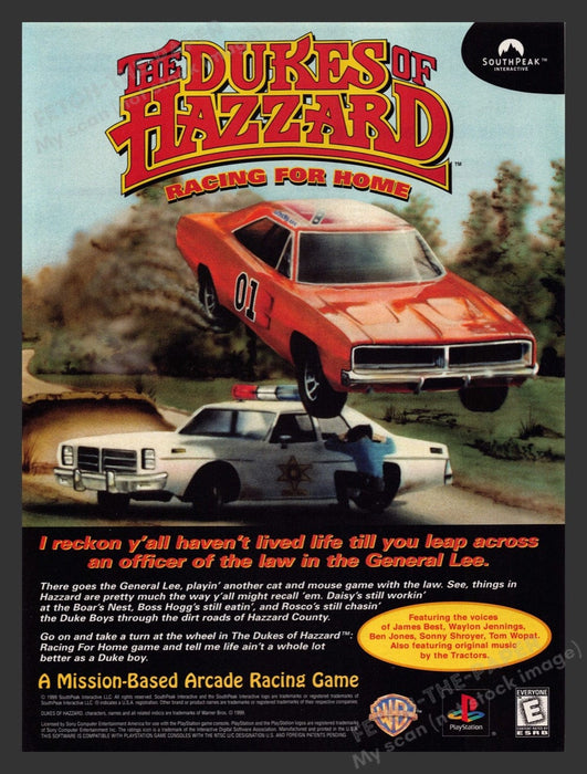 Step into the thrilling world of Hazzard County with "The Dukes of Hazzard: Racing for Home" print advertisement from 2000. This vibrant ad showcases the iconic General Lee car leaping across a police vehicle, capturing the essence of the high-speed chases and adventures that defined the beloved TV series. The ad invites players to experience the excitement of a mission-based arcade racing game, featuring familiar characters and voices from the show.