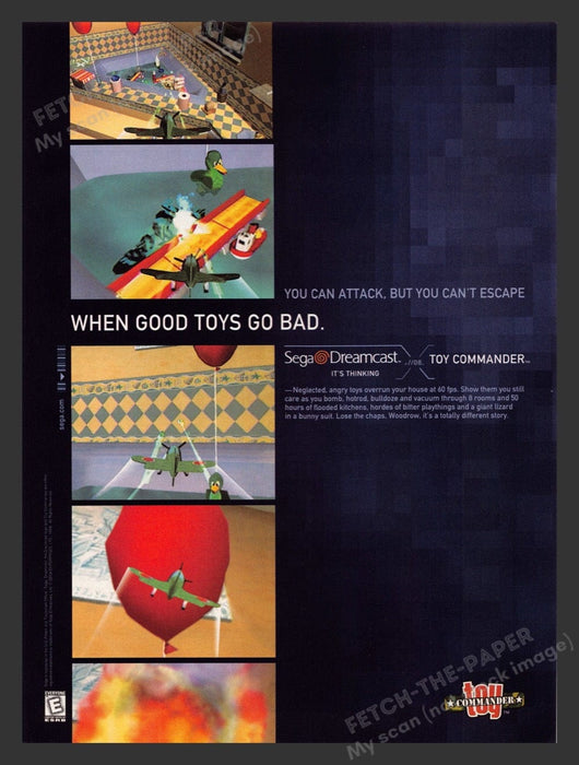 Step back into the early 2000s with this original print advertisement for the video game "Toy Commander" on Sega Dreamcast. This ad vividly captures the chaotic and adventurous spirit of the game, showcasing scenes where neglected toys wreak havoc in a household setting. The vibrant imagery and playful yet intense scenarios depicted are sure to evoke nostalgia for gamers who enjoyed the unique premise of battling through rooms filled with everyday objects turned battlegrounds.