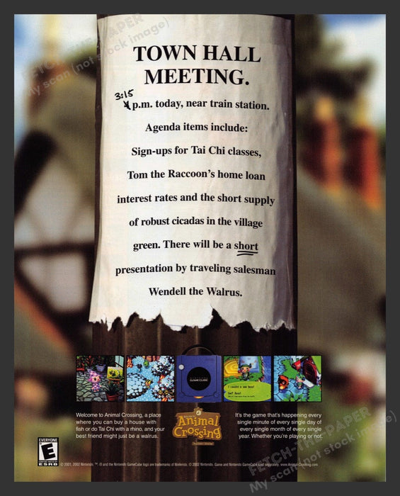 This vintage 2002 Animal Crossing print advertisement captures the whimsical charm of the early 2000s gaming era. The ad features a playful "Town Hall Meeting" announcement, detailing various agenda items like Tai Chi class sign-ups, home loan interest rates with Tom the Raccoon, and a presentation by Wendell the Walrus. The background showcases vibrant in-game scenes, emphasizing the game's engaging and dynamic world.