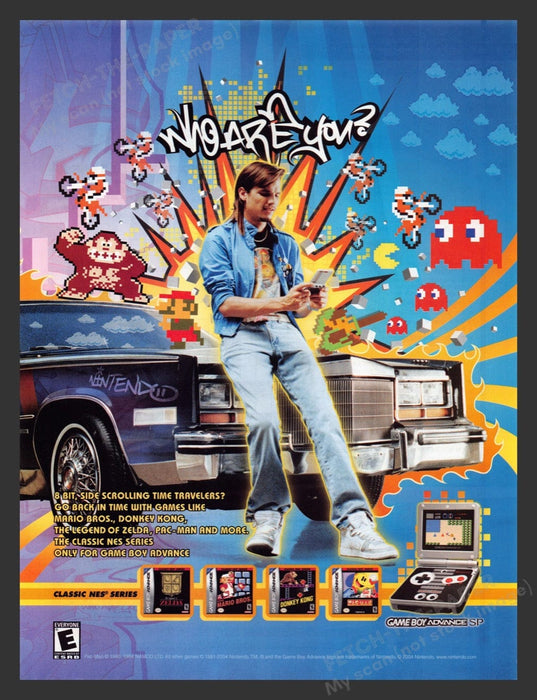 Step back into the 2000s with this vibrant print advertisement for the Gameboy Advance SP Classic NES Series from 2004. The ad features a young man engrossed in his Gameboy Advance SP, surrounded by iconic 8-bit characters like Donkey Kong and Pac-Man, capturing the nostalgic essence of classic gaming. The backdrop showcases a colorful explosion of pixel art and graffiti, emphasizing the retro appeal of the NES series games available for the handheld console.
