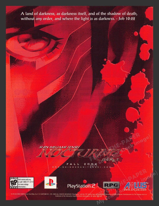 This 2004 advertisement for the video game "Shin Megami Tensei: Nocturne" captures the dark and intense atmosphere of the game. The ad features a striking red and black color scheme with an ominous eye, evoking the game's themes of darkness and chaos. A quote from Job 10:22 adds to the eerie and foreboding mood, making it a memorable piece for fans and collectors of early 2000s video game memorabilia.