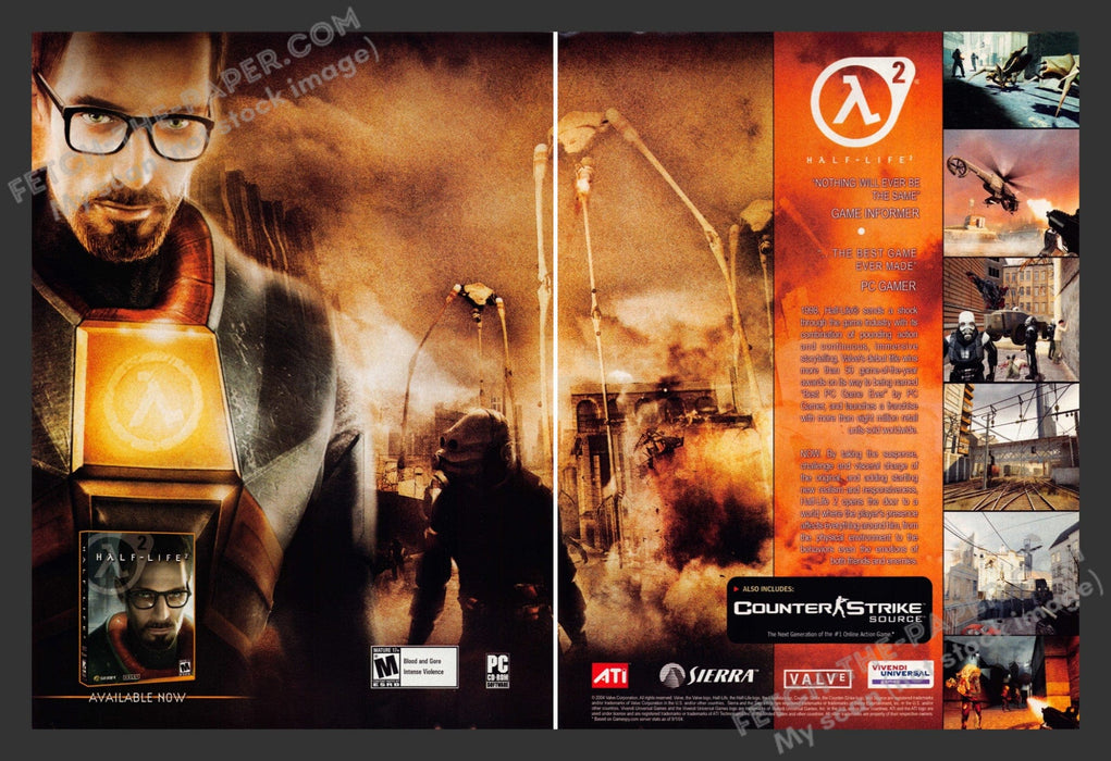 This is a captivating 2000s print ad for the iconic video game, Half-Life 2. The two-page spread showcases the intense and immersive world of the game, featuring a striking image of the protagonist, Gordon Freeman, with his signature glasses and HEV suit. The background depicts a dystopian cityscape under siege by towering alien machines, highlighting the game's thrilling atmosphere and groundbreaking graphics.