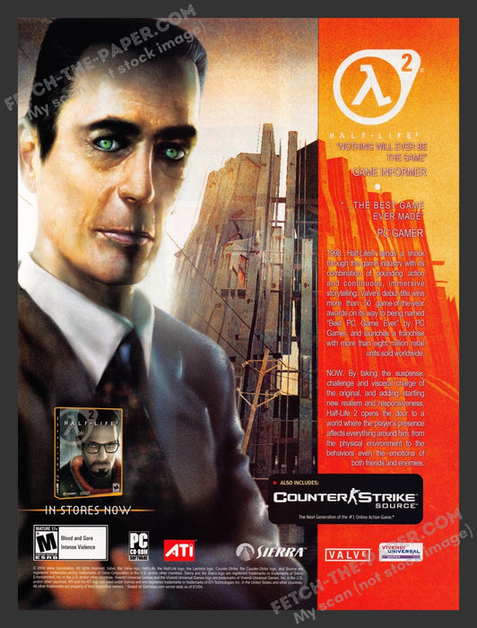 This 2005 print ad for the iconic video game Half-Life 2 captures the essence of the early 2000s gaming era. The ad features a striking image of one of the game's characters, showcasing the detailed graphics and immersive world that Half-Life 2 is renowned for. The backdrop includes a futuristic cityscape, emphasizing the game's setting and atmosphere.