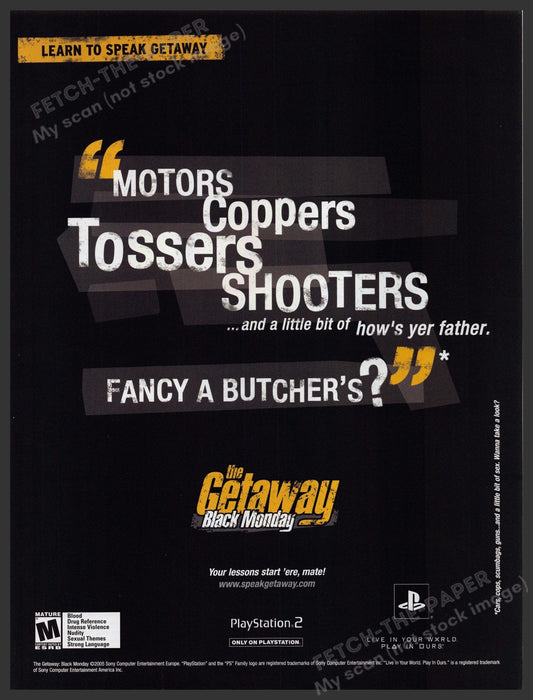 This 2005 print advertisement for "The Getaway Black Monday" video game captures the gritty and immersive atmosphere of the game. The ad features bold text with British slang, inviting players to "Learn to Speak Getaway" with phrases like "Motors," "Coppers," "Tossers," and "Shooters." This evocative language sets the tone for the game's intense and action-packed narrative.