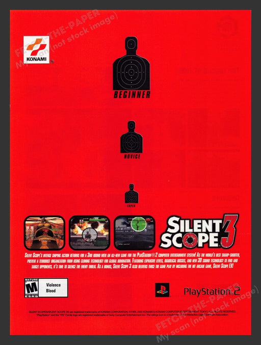 This is a vintage print advertisement from the 2000s, showcasing the video game Silent Scope 3, released in 2002 for PlayStation 2. The ad features...