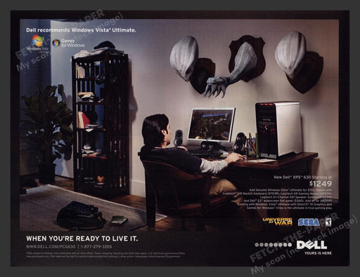 This 2008 Dell Computer print advertisement features a gamer deeply immersed in the game "Universe at War," showcasing the powerful Dell XPS 630 de...