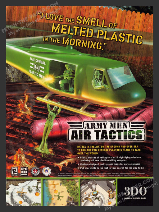 This vibrant 2000s print advertisement for the video game "Army Men: Air Tactics" captures the thrilling essence of plastic warfare. The ad feature...