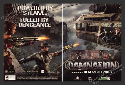 This is a 2008 print advertisement for the video game "Damnation." The ad features a dramatic scene set in a steampunk-inspired world, showcasing c...