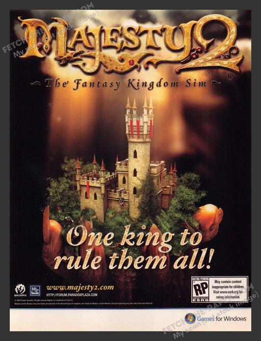 This is a print advertisement from the 2000s for the video game "Majesty 2: The Fantasy Kingdom Sim" released in 2009. The ad features a captivatin...