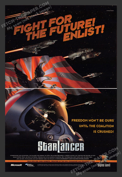 This is a captivating 2000s video game print advertisement for "Starlancer." The ad features a dramatic space battle scene with starships and a bol...