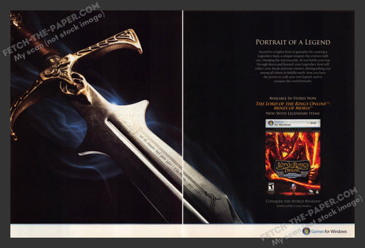 This 2009 magazine print ad for "The Lord of the Rings: Mines of Moria" video game showcases a stunning image of a legendary sword, symbolizing the...