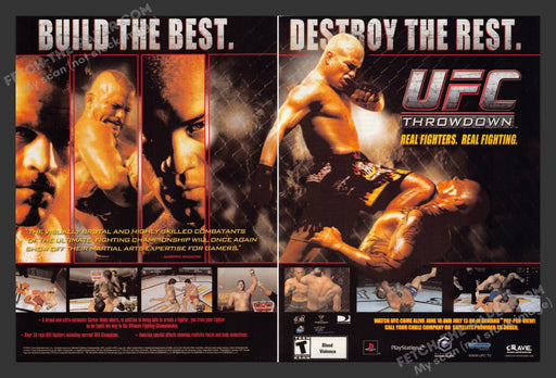 This is a 2002 print advertisement for the video game UFC Throwdown. The ad showcases intense and realistic fighting scenes, capturing the essence ...