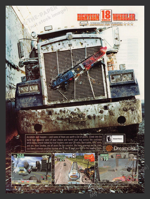 This 2001 print advertisement for "Eighteen Wheeler: American Pro Trucker" showcases the rugged and intense world of professional truck driving. Th...