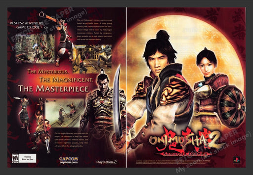 This is a captivating 2000s video game print advertisement for "Onimusha 2: Samurai's Destiny," a renowned PlayStation 2 game released in 2002. The...