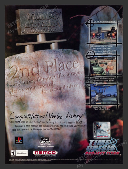 This 2001 magazine advertisement for "Time Crisis: Project Titan" showcases the action-packed gameplay and features of this beloved 2000s video gam...