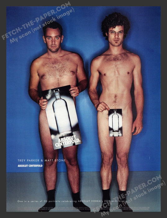 This 2000s print ad features Trey Parker and Matt Stone in a bold and humorous portrayal for Absolut Vodka. The advertisement showcases the duo standing against a blue background, each holding an Absolut Vodka bottle strategically placed to cover themselves, emphasizing a playful and daring aesthetic typical of the era.