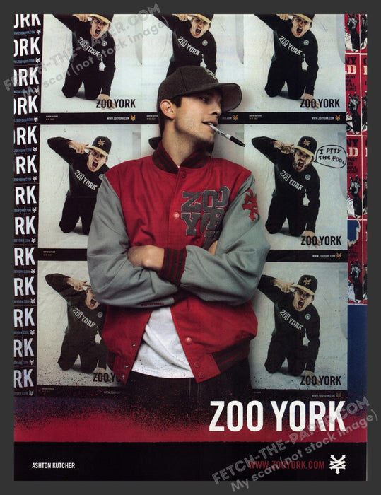 This Zoo York Clothing print ad from the 2000s features actor Ashton Kutcher. The advertisement showcases Kutcher in a stylish Zoo York varsity jacket, leaning against a wall plastered with dynamic posters of himself in various energetic poses. The backdrop highlights the edgy and urban vibe that Zoo York is known for, capturing the essence of early 2000s streetwear culture.