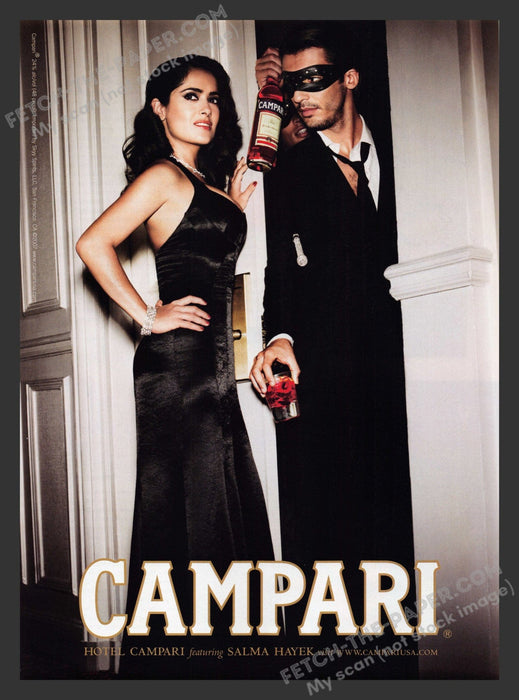 This captivating 2007 print ad for Hotel Campari features the renowned actress Salma Hayek alongside a masked man, exuding an air of mystery and sophistication. The image captures the essence of elegance and allure typical of the 2000s, with Hayek in a stunning black gown and the masked man holding a bottle of Campari, set against a luxurious backdrop.