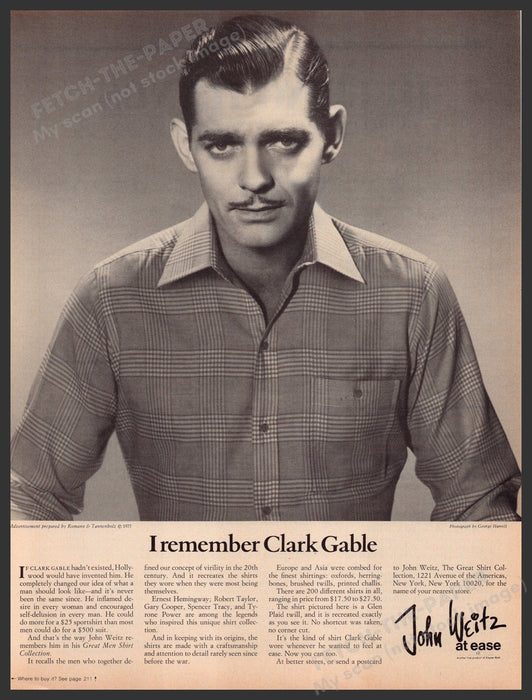 This 1977 John Weitz Shirt Collection advertisement features the iconic Clark Gable, showcasing the elegance and style of the 1970s. The ad highlights a Glen Plaid shirt, meticulously recreated to reflect the craftsmanship and attention to detail that defined the era. The image captures Gable's classic Hollywood charm, emphasizing the timeless appeal of the John Weitz brand.