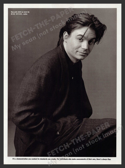 This magazine photo from the 1990s features actor Mike Myers in a stylish Gap polo shirt. The black and white image captures Myers in a relaxed yet confident pose, embodying the essence of the decade's fashion trends.
