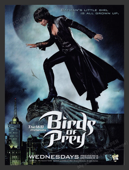 This is a captivating 2002 print advertisement for the premiere of the T.V. show "Birds of Prey." The ad features the character Huntress, played by...