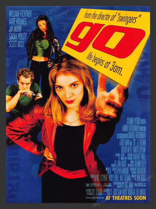 This 1999 print advertisement showcases the movie "Go," featuring prominent actors such as William Fichtner, Katie Holmes, Jay Mohr, Sarah Polley, ...