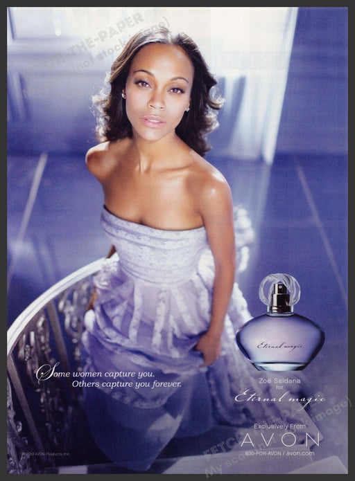 This 2010s print advertisement features Zoe Saldana for Avon's Eternal Magic fragrance. The ad showcases Zoe Saldana in an elegant, ethereal settin...