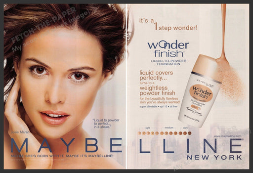 This captivating 2004 Maybelline Cosmetics print advertisement features the stunning Josie Maran showcasing the Wonder Finish Liquid-to-Powder Foun...