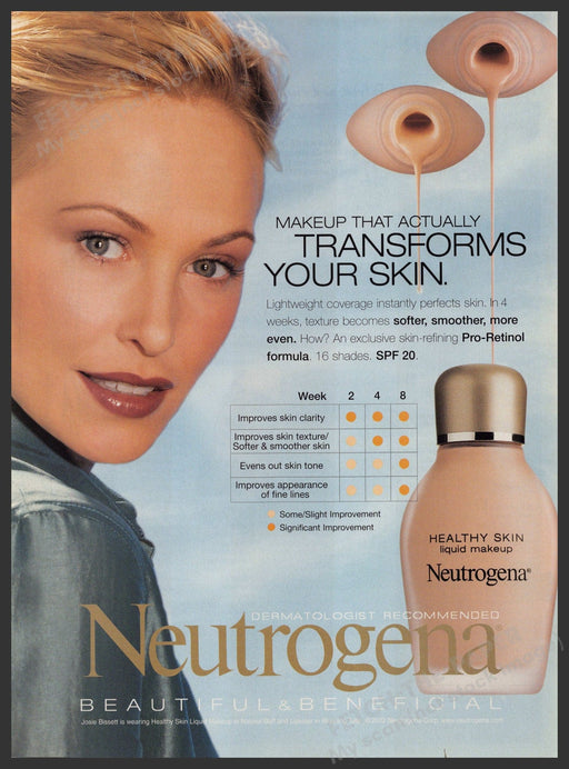 This 2002 Neutrogena print advertisement features Josie Bissett showcasing the transformative power of Neutrogena's Healthy Skin Liquid Makeup. The...