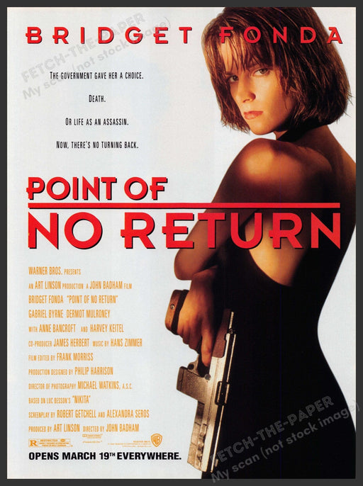 This is an original 1993 print advertisement for the movie "Point of No Return" featuring Bridget Fonda. The ad showcases a striking image of Bridg...