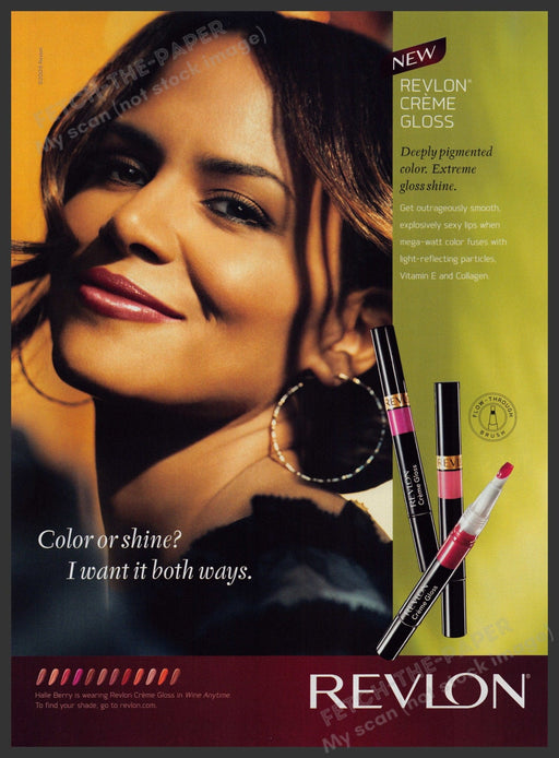 This 2009 Revlon Creme Gloss magazine advertisement features a stunning image of Halle Berry showcasing the product's vibrant color and extreme glo...