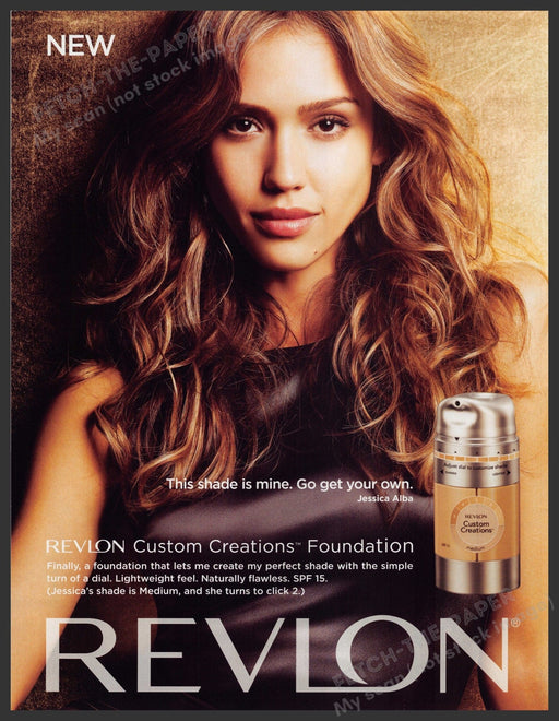 This 2008 Revlon Custom Creations Foundation advertisement features the stunning Jessica Alba, showcasing her flawless complexion. The ad highlight...