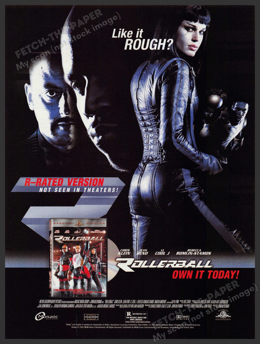This original 2002 print advertisement for the movie "Rollerball" features an intense and action-packed visual, highlighting the R-rated version no...