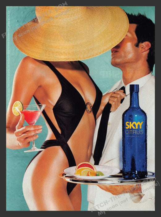 This captivating 2000s Skyy Citrus Vodka print ad showcases a glamorous scene with a woman in a revealing black swimsuit and a large sunhat, holding a cocktail. The image exudes sophistication and allure, capturing the essence of the decade's bold and stylish advertising trends. The man in the background adds an element of intrigue, making this ad a striking piece for collectors.