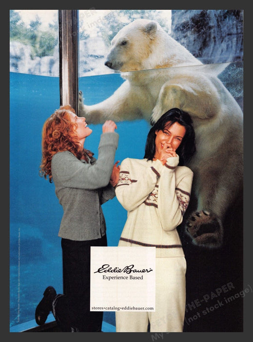 This 2000 Eddie Bauer print advertisement captures a delightful moment of two women interacting with a majestic polar bear through a glass enclosure. The ad showcases the brand's cozy and stylish winter clothing, emphasizing warmth and comfort suitable for cold climates. The scene reflects the adventurous and nature-loving spirit of the early 2000s, making it a nostalgic piece for collectors.
