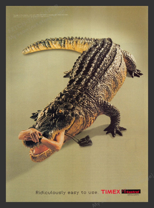This striking 2000 Timex Watches I-Control print advertisement showcases a dramatic and humorous scene where an alligator is seen biting a person's arm, emphasizing the tagline "Ridiculously easy to use." The ad creatively highlights the durability and user-friendly nature of Timex watches.