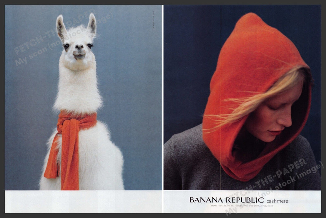 This is a captivating 1999 Banana Republic cashmere advertisement, showcasing the luxurious and cozy appeal of their clothing line. The two-page spread features a striking image of a llama adorned with a vibrant orange scarf on one side, and a serene portrait of a woman wearing an orange cashmere hood on the other. The contrasting visuals highlight the elegance and warmth of Banana Republic’s cashmere collection from the 1990s.