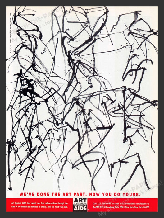 This 1990 Art Against Aids advertisement features an abstract artwork by the renowned artist Brice Marden from 1986. The ad showcases a series of intricate, black ink lines on a white background, creating a complex and engaging visual experience. The text at the bottom emphasizes the importance of contributing to the fight against AIDS, urging viewers to take action.