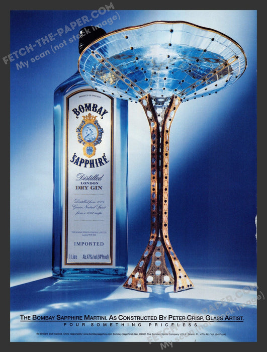 This 2001 Bombay Sapphire advertisement showcases a striking image of a Bombay Sapphire bottle alongside an artistically crafted martini glass by Peter Crisp. The ad emphasizes the elegance and sophistication of Bombay Sapphire gin, highlighting its premium quality and the artistry involved in its presentation.
