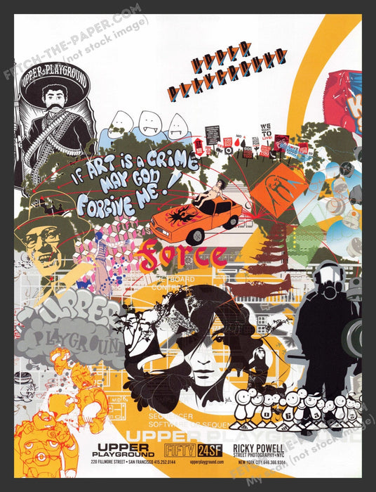 This vibrant and eclectic print advertisement from the 2000s showcases the artistic flair of Upper Playground and the renowned street photographer Ricky Powell. The ad features a dynamic collage of urban art, graffiti, and pop culture elements, capturing the rebellious and creative spirit of the early 2000s. The phrase "If Art is a Crime May God Forgive Me" stands out prominently, reflecting the bold and unapologetic attitude of the era.