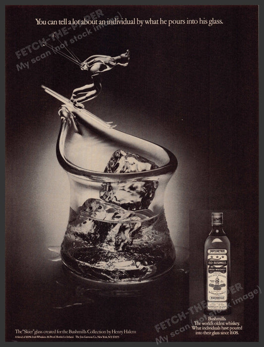 This 1977 print advertisement showcases the unique "Skier" glass created for the Bushmills Collection by Henry Halem. The ad features a striking image of the glass with an intricate skier design, emphasizing the elegance and craftsmanship of the piece. Alongside the glass, a bottle of Old Bushmills Irish Whisky is prominently displayed, highlighting the rich heritage of the world's oldest whiskey.