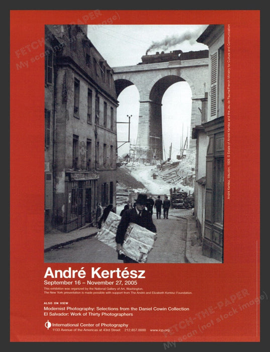 This vintage print advertisement from the 2000s promotes an art gallery show featuring the works of renowned photographer André Kertész. The ad highlights his iconic photograph "Meudon" from 1928, capturing a moment in time with a steam train crossing a viaduct above a bustling street scene. This piece was part of an exhibition held at the International Center of Photography in New York City from September 16 to November 27, 2005.