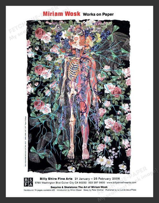 This captivating magazine print ad from the 2000s showcases Miriam Wosk's art exhibition titled "The Phenomenology of the Self" at Billy Shire Fine Arts in Culver City, CA. The advertisement features a vibrant and intricate artwork depicting a human figure intertwined with floral and anatomical elements, reflecting Wosk's unique artistic style.
