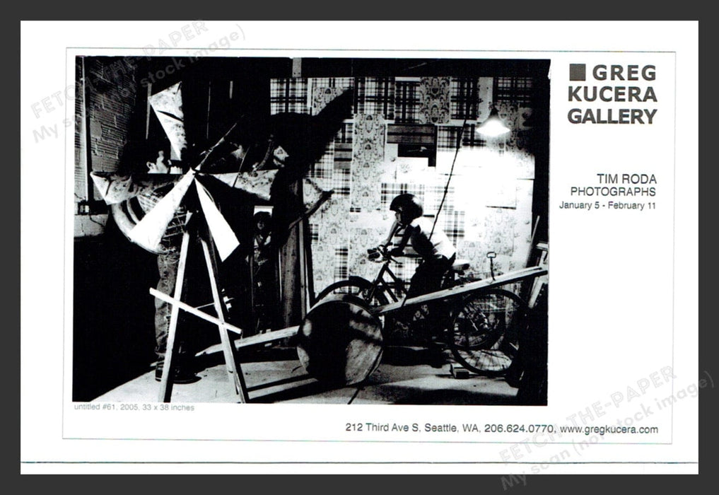This vintage print advertisement from the 2000s promotes a photography exhibition by Tim Roda at the Greg Kucera Gallery in Seattle, WA. The ad features a black and white photograph showcasing an intriguing scene with a person on a bicycle amidst an artistic setup. The exhibition ran from January 5 to February 11, 2006, highlighting the creative works of Tim Roda.