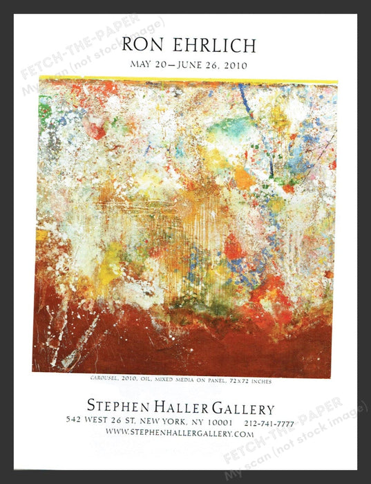 Experience the vibrant and dynamic world of Ron Ehrlich with this original print advertisement for his 2010 art gallery show at the Stephen Haller Gallery in NYC. The ad features a striking reproduction of Ehrlich's work "Carousel," showcasing his masterful use of oil and mixed media on panel. This piece captures the essence of the early 2010s art scene, making it a must-have for collectors and enthusiasts.