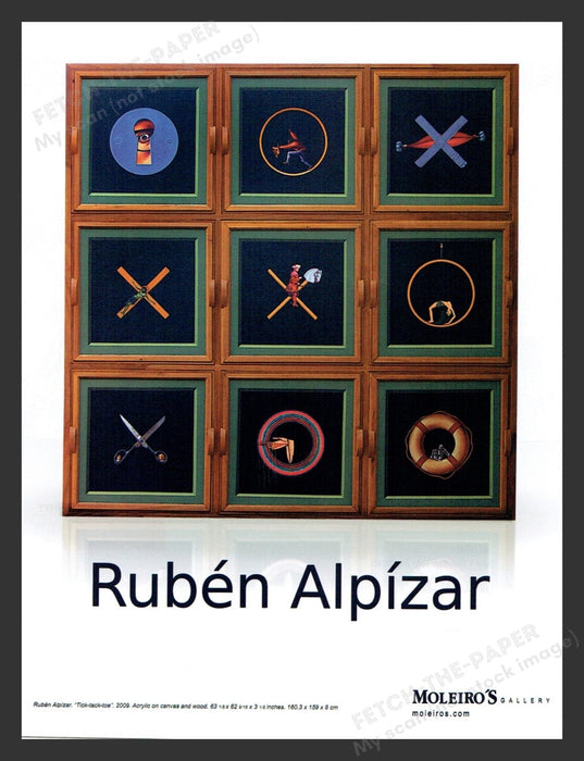 This is a print advertisement for Ruben Alpizar's 2010 art gallery show at Moleiro's Gallery, featuring his work titled "Tick-Tack-Toe." The ad showcases a vibrant and intriguing piece composed of nine individual squares, each depicting unique and surreal imagery. This artwork, created with acrylic on canvas and wood, measures approximately 8.5" x 11". The ad captures the essence of Alpizar's distinctive style, blending whimsical elements with thought-provoking visuals.