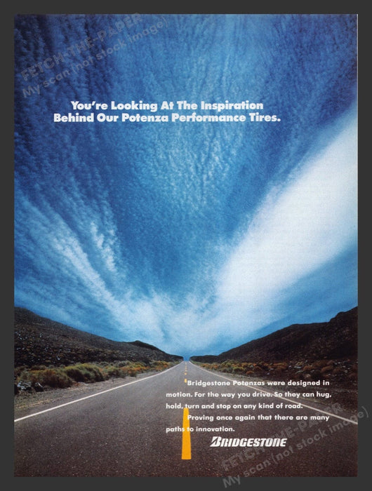 This vintage 1990s print advertisement showcases the Bridgestone Potenza Performance Tires. The ad features a striking image of an open road under a vast, dramatic sky, symbolizing the inspiration and innovation behind these high-performance tires. The text emphasizes the design and capability of the Potenza tires, highlighting their ability to hug, hold, turn, and stop on any kind of road.