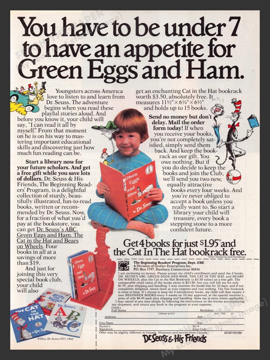 This 1987 Dr. Seuss & His Friends "Green Eggs and Ham" print advertisement captures the whimsical charm of Dr. Seuss's beloved children's books. The ad features a young child engrossed in reading "Green Eggs and Ham," surrounded by colorful illustrations of iconic Dr. Seuss characters. It promotes a special offer to get four books for just $1.95 along with a free Cat in the Hat bookrack, emphasizing the joy and educational value of reading for young children.